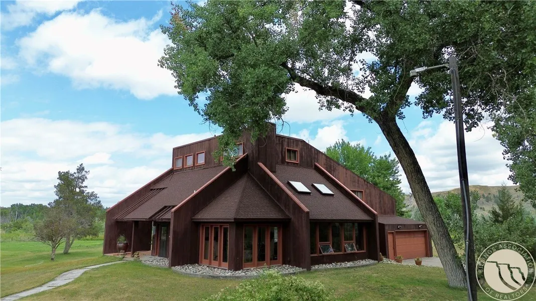23.33 Acres on the Yellowstone River. Contemporary home with 3 bedrooms, 2.5 baths. Architecturally designed for an artist. Very solid structure with huge windows throughout. Spiral Staircase to the 2nd and 3rd floors. Redwood siding. 2 heat zones. Central air. Additional electric heat in kitchen and sunroom, rarely used. Quadra Fire wood stove. Ceramic tile floors. Hardwood floors. Wet bar on 3rd floor. First Floor includes Foyer, Kitchen, Living Room, Sunroom, Breakfast Nook, Dining Room, Half Bath, Large Laundry Room/Pantry and Mudroom. Living Room opens into the courtyard which is enclosed with a block retaining wall. Two balconies. Skylights. Log guest cabin has 1 bedroom, 1 bath, 352 SF w/front porch, wood stove. Set up for horses with fence, 12x18 shelter and automatic waterer. 14+ deep pond with variety of ducks, turtles, fish, etc. Very private (gated, end of road) and quiet.