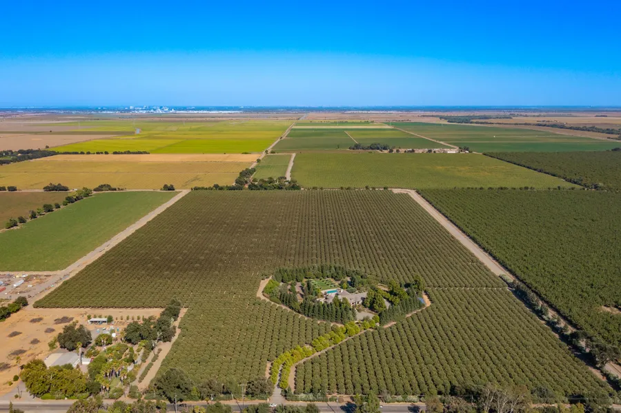 A refined luxury estate & income producing agricultural opportunity. The 91 +/- acre site includes 80 acres planted to pistachios, on prime Class 1 soils. A Maple lined drive meanders through the orchard, arriving at the landscaped enclave, private & shaded by Redwoods. The elegant residence includes 5 BDs & en-suite BAs, an office/sewing room. The residence showcases KC Limestone & includes a formal dining room, living room, library, wine cellar, & family room that opens to a gourmet kitchen with 2 islands, granite countertops, butler's pantry & Maple flooring throughout. The outdoor space features sprawling lawns, a sparkling pool, spa with outdoor shower, multiple seating areas, flagstone walkways & many garden areas including berries, herb beds, orchards, & fenced raised garden beds with room for chickens. The outdoor kitchen exudes character with imported & repurposed brick from a Chicago firehouse. Additional features include a 5-car garage, ag barn & grid-tied solar. Productive pistachio operations are supported by strong private water resources, assuring crop longevity. The economic benefits of the farming operations offset ownership costs, offering an intriguing investment proposition. This agrarian estate is the perfect blend of rural serenity & elevated living.