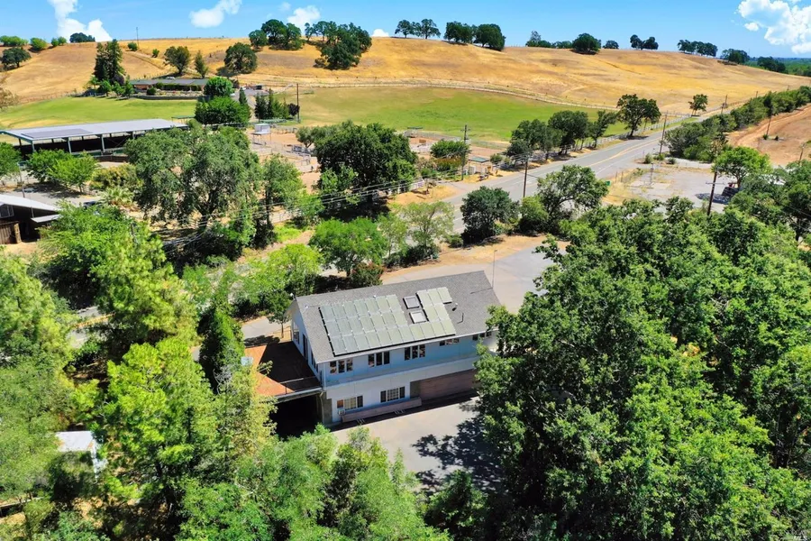 Rare Opportunity. Live year round on the shores of Putah Creek, gateway to Lake Solano and just minutes away from Lake Berryessa. Almost 3/4 acre of Resort style living. Huge 2 car garage with shop area and attached possible family unit living space w/full bath. Tons of paved off street parking, circle drive and covered RV parking with all hook ups. 1698 sq ft living area with dual pane windows, great room and deck for indoor/outdoor living. Filtered views through the trees of the hillsides and Putah Creek. Master bedroom with large walk in closet and deck. Finished bonus attic room with standing room. Solar is owned.