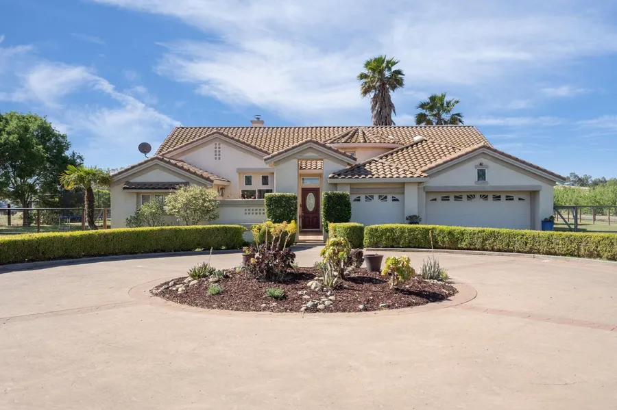 Fresh paint and price on this Gorgeous spanish style custom home, no expense was spared for this breathtaking home out in the countryside. The spacious open floor plan boasts 12-15 ft high vaulted ceilings, beautiful travertine tile with ornate mosaic inserts,an extra large chef's kitchen that holds an array of organization in beautiful custom cabinetry and multiple pantry's.The tall custom windows stream an abundance of sun light in while exposing a gorgeous view of the horse facilities and view below.The expansive Master Suite is privately tucked to one side with patio access,accompanying master bathroom and an additional office with separate entrance through the quaint tiled courtyard. From the stamped concrete circular drive, hundreds of established fruit and nut trees, owned solar, stalls, paddocks, pastures, and sturdy shipping container barn. This beautiful custom home with horse amenities has something for everyone, you only need make it your own.
