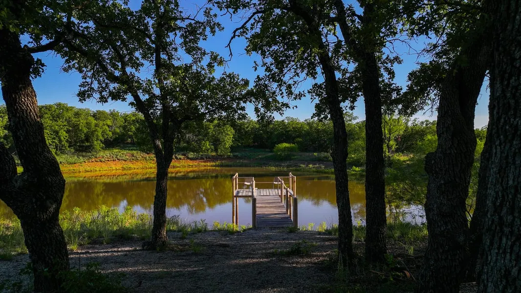 Peacock Ranch features a large, flat-topped hill that occupies the northwestern portion of the property, creating an oasis of seclusion for its charming house. The delightful backyard features the enchanting Catfish Pond. This captivating body of water is visible from the house, surrounded by majestic cottonwoods and a charming fishing dock, making it an ideal destination for relaxation and enjoyment. Just a short drive from the house, higher up the hillside, visitors can enjoy dramatic views and discover another fishing pond stocked with bass, complete with a dock. This portion of Young County is adorned with post oak-covered hills home to abundant wildlife, offering additional opportunities for recreation and potential water features.