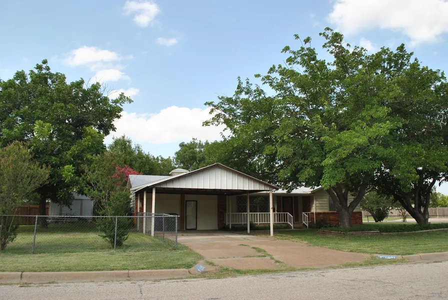 Clean and move-in ready two (2) bedroom, two (2) bathroom, two (2) car carport brick and frame home on an oversized corner lot; Located on the corner of Carolina and Morado in Graham with a stellar yard and beautiful trees; Central heat & air; Living room features carpet and a lighted ceiling fan; Open concept kitchen and dining area with vinyl flooring; Kitchen features a double stainless steel sink, dishwasher, free-standing electric range, lighted vent-a-hood and refrigerator; Formica countertops with breakfast peninsula and ample cabinetry; Adjacent to the dining area is a doorway entrance to the enormous sunroom with carpet and windows overlooking the chain-link fenced backyard; Wood privacy fence along the north property line separates the backyard from the neighboring yard; Master bedroom features carpet, two closets and a master ensuite with a step-in tile shower, vanity with sink, mirrored medicine cabinet and toilet; The bathroom in the hallway has a tile surround tub/shower combination, large vanity with sink; mirrored tri-fold medicine cabinet and toilet; Decorative light fixtures, ceiling fans and window treatments throughout; Office or playroom could easily be converted into a third (3rd) bedroom; Washer and dryer closet with full-size washer/dryer connections and hot water heater; Wheelchair ramp and hand rails; Workshop or hobby room with electricity, shelves and workbench is under roof adjacent to the carport; Two storage buildings; In-ground cellar; Spacious and neat home with loads of investment potential! Price reduced to $99,900!