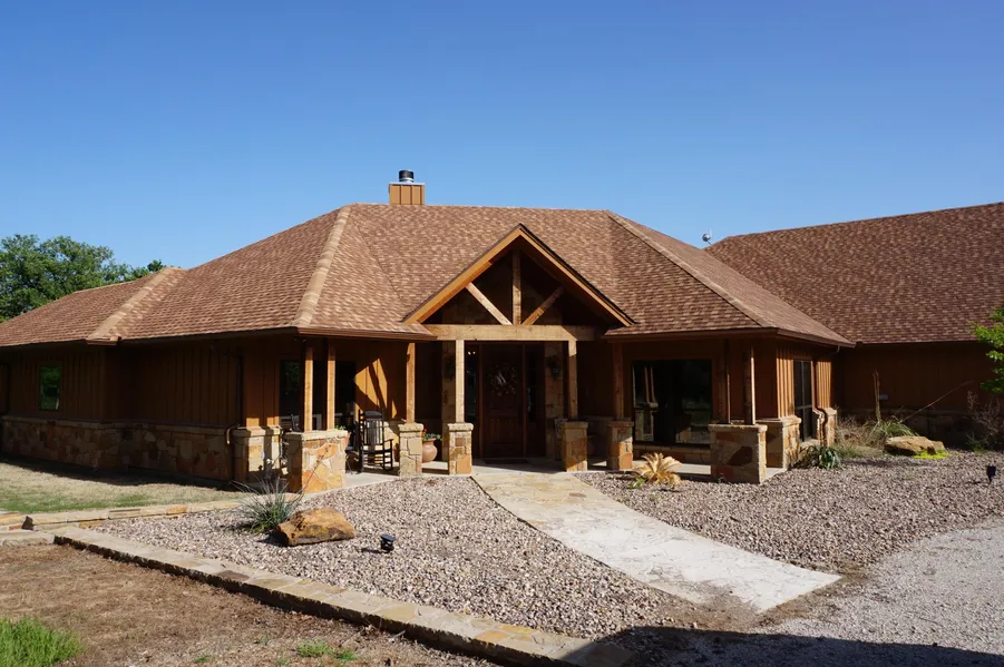 Stunning, rock/brick/cedar home on 42.06 wooded acres, m/l, minutes from Graham; Built in 2014 this 4/3.5/2/2 cc has hardwood floors in the den, living room, dining area, office, kitchen, breakfast nook and hallways; Carpet in all the bedrooms and stained concrete in the utility and mud room; The den has a rock WBFP and vaulted, beamed cedar barrel ceiling; The spacious "gourmet kitchen" features a custom mesquite wood breakfast bar, granite counter tops, an island, 5-burner smooth surface induction cook top, SS refrigerator, built-in dishwasher, double ovens, microwave, lighted vent-a-hood, walk-in pantry and butler's pantry; Breakfast nook, living room and kitchen "open concept"; French doors in the living room, master bedroom and living area each exits to the large, outdoor flagstone living space, which offers secluded tranquility; The spacious master ensuite has a large walk-in U-sha...