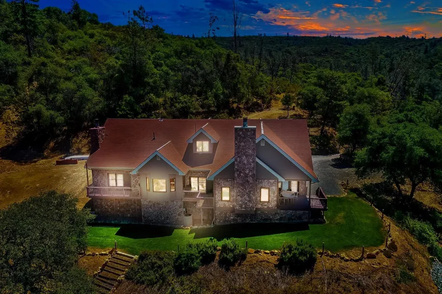 Stunning off grid Home with Lake views. Secluded with gated driveway. Panoramic views of Collins Lake, and the foothills. Fully self contained property with a residential Well, natural spring for irrigation/landscape, New Septic tank, 18 240 watt Solar panels with battery backup, 4 cylinder Mitsubishi Generator, powered by Propane. The interior boasts cathedral ceilings, Carpet, hardwood, and Travertine tile flooring. The Kitchen has vast countertop space, Large Buffet built in, with tons of cabinetry for storage. The Master Bedroom and Bath are grand, with a fireplace, loft office with hardwood spiral staircase, Access to Deck from Master, and a sitting area inside. The Master Bathroom has a luxury resort feel. Massive walk in shower with multiple shower heads. whirlpool Tub. Upstairs has a Bedroom and a great room, that could be a family room, or 4th Bedroom, with a full bathroom. Ever...
