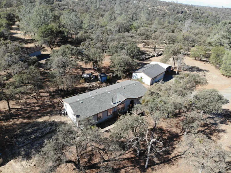 Main bedroom situated on opposite side from other bedrooms for privacy. Open floor plan. 10 acres of usable land; fenced and cross-fenced. Outbuildings, including a 2 car detached garage. Seasonal creek on property with end of road privacy.