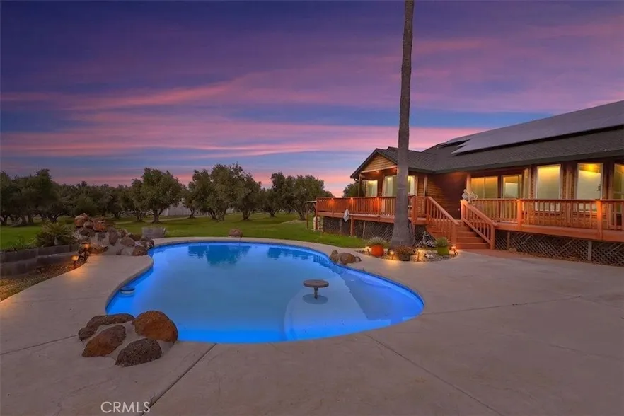 MOTIVATED SELLER!! 5388 E Burris Rd- Nestled on 5.54 acres of flat, usable land with a producing olive grove, this custom-built 1991 home offers stunning views of the Yuba Sutter Buttes and breathtaking sunsets. The fenced property features a private entry gate, 13W of owned solar (66 panels), a 320 sq. ft. custom-built pine shed, and BVID hookup. Enjoy an in-ground gunite pool with a Cabo shelf and water feature, plus a new pool pump (2024). Inside, the open floor plan seamlessly connects the kitchen, family room, and breakfast nook. The kitchen boasts a large center island with stovetop, stainless steel appliances, marble countertops, a walk-in pantry, and a new dishwasher (2024). The living and family rooms feature vaulted ceilings, plantation shutters, and a pellet stove. The master suite includes deck access, a walk-in closet, jetted tub, radiant heated floors, and a walk-in shower....