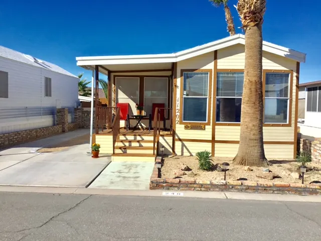 Here's a remarkable home in Yuma Venture, where you own your land! This floorplan has an unadvertised 144 square feet of living space! The seamless entry from the dining area to the enlarged living room allows for a spacious and open lifestyle .The upgraded kitchen is fashionable and inviting. The floors in the kitchen and bathroom are vinyl wood-grained plank. The bath has upgraded sink, toilet and plumbing. Washer and dryer is in the shed. You will enjoy the view and evening sunset from the back porch!
