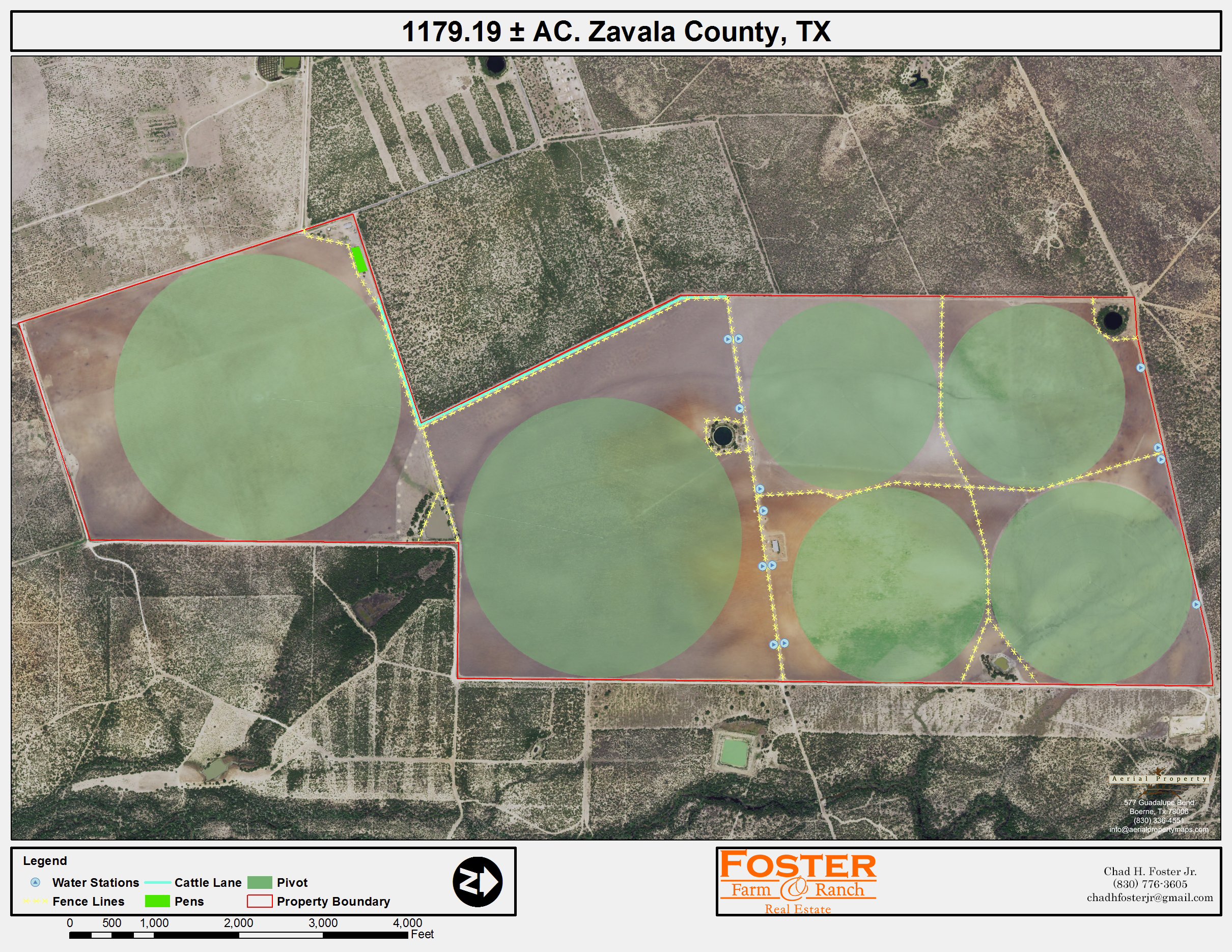 An incredible farm with great water resources. 800 acres under pivot. All pivots on the property are new. There are 3 electric wells on the farm that are approximately 1100 feet deep. The pumps are set at 600 feet with the static water level being at 260 feet. All pumps and panel boxes are new. There are two barns on the property. One is 60 x 120, the other is roughly 60 x 60. There are 3 man made reservoirs on the farm for additional water. The entire farm is high fenced. Three of the pivots are planted in permanent bermuda, and currently over seeded with wheat and rye grass. The remainder of the property is planted in a wheat and rye grass mix. A newly constructed set of cattle pens are located at the front of the property and connected to the pastures by a long alley. All interior and pasture fences are newly constructed as well.